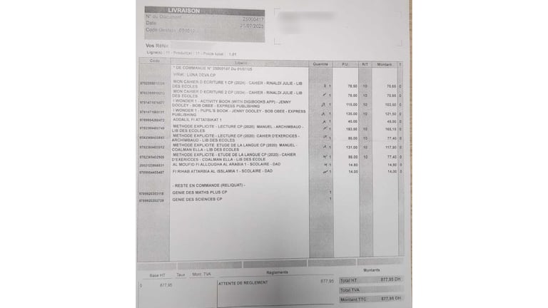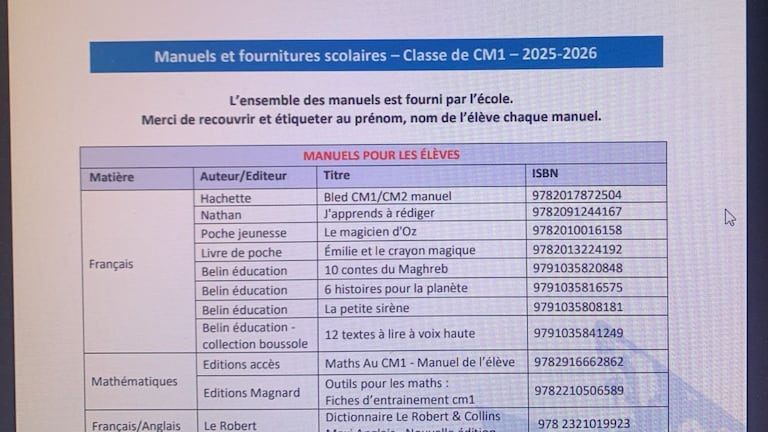 La liste des manuels et fournitures scolaires demandés par une école privée avec la mention: les manuels seront mis à la disposition des élèves à la rentrée