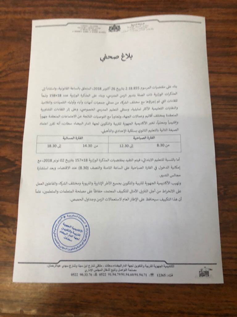 Ce vendredi, l'Académie régionale de l'éducation et de la formation de la région Casablanca-Settat fait savoir qu'elle adopte l'horaire suivant:-Matin: de 8h30 à 12h30.-Après-midi: de 14h30 à 16h30.