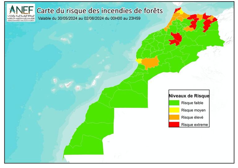 L’ANEF signale également dans son bulletin journalier un risque élevé (niveau orange) dans les provinces de Larache, Chefchaouen, Ouezzane, Driouch, Sefrou, Taroudant, Berkane, Driouch, Rabat, Skhirat-Témara, Salé et Kénitra. Un risque moyen (niveau jaune) est par ailleurs indiqué dans les provinces de Tétouan, Mdiq-Fnideq et Agadir Ida-Outanane.