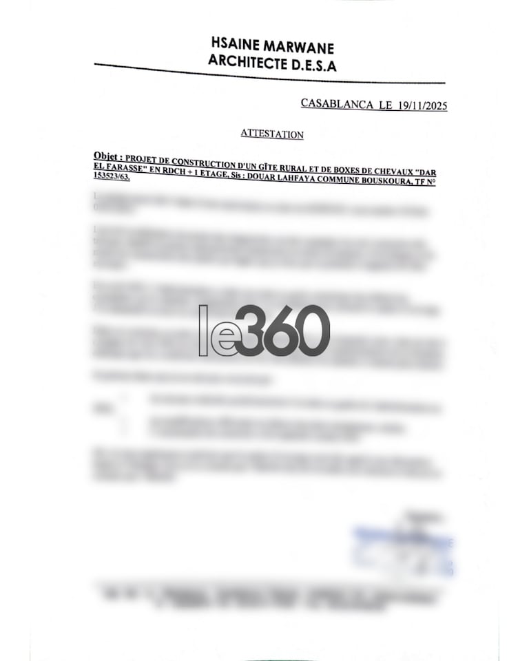 Intitulée «Projet de construction d’un gîte rural et de boxes de chevaux Dar El Farasse», l’attestation précise que le projet, situé au Douar Lahfaya dans la commune de Bouskoura, avait obtenu une autorisation initiale le 6 août 2021. Cependant, au fil des travaux, Hsaine Marwane a relevé des écarts significatifs par rapport aux plans validés, notamment en termes de hauteur, d’enveloppe et de mode de construction (dur plutôt que léger).