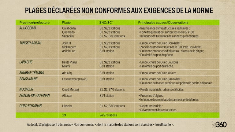 En revanche, 13 plages ont été déclarées non conformes aux exigences de la norme NM 03.7.199, représentant 24 stations de contrôle sur 27 jugées insuffisantes. Ces sites se répartissent dans plusieurs provinces, notamment Al Hoceima (Calabonita, Quemado, Sabadilla), Tanger-Asilah (Jbila III, Sidi Kacem, Asilah Port), Larache (Petite Plage, Miami), ainsi que Skhirat-Témara (Aïn Atiq), Benslimane (Essanawab-David), Nouaceur (Oued Merzeg), Agadir (Aftasse) et Oued Ed Dahab (Lkheira).