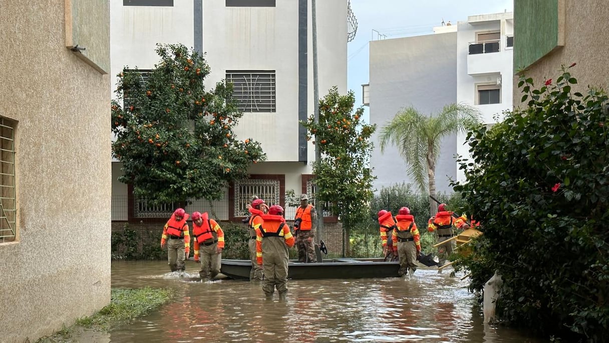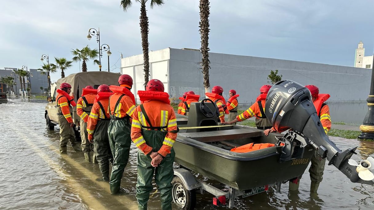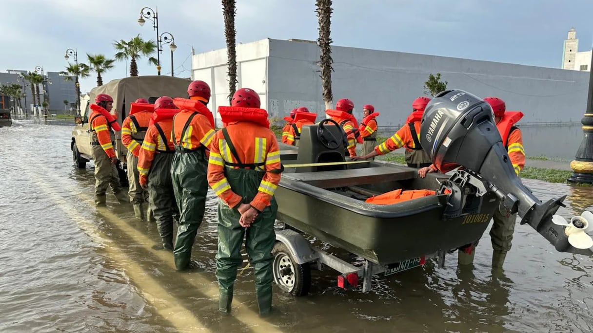 Sur la route de Larache, l’eau a effacé les repères. Les rues se confondent avec le lit du fleuve débordé, et seuls les sommets de quelques trottoirs et quelques panneaux de signalisation émergent de cette étendue. À bord d’un bateau de sauvetage, les éléments des FAR progressent lentement, scrutant les façades, attentifs au moindre signe.