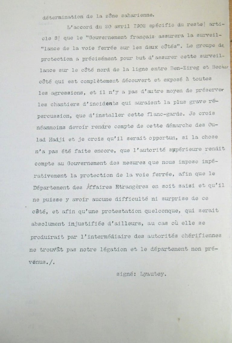 Le général Lyautey, alors responsable des confins, s’appuya sur l’autorité des caïds marocains de la région et invoqua l’article 2 du traité franco-marocain de 1902, qui accordait à la France le droit de sécuriser la ligne de chemin de fer menant à Béchar. Cette disposition fut interprétée de manière extensive pour justifier une présence militaire et administrative croissante dans des zones relevant historiquement de la souveraineté chérifienne.