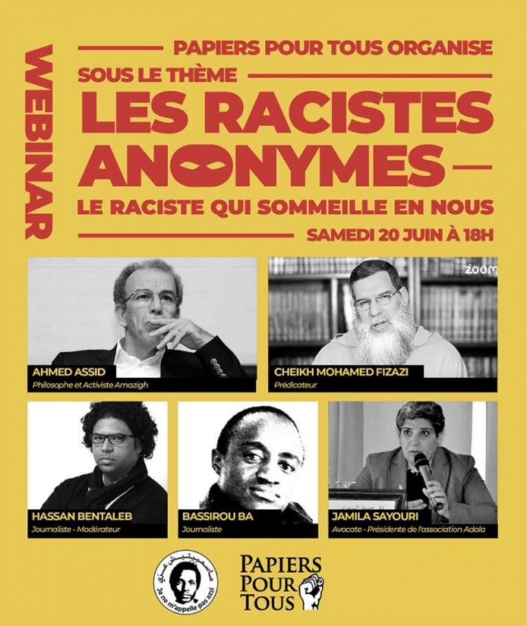 Le collectif Papiers pour tous, créé au lendemain de la première campagne de régularisation des migrants en 2014, organise un webinaire sur le racisme. "Les racistes anonymes, ce raciste qui sommeille en chacun de nous" est le thème de ce séminaire programmé samedi 20 juin à 18h00 sur la page Facebook du collectif. La conférence live, qui se tiendra à l'occasion de la Journée mondiale du réfugié, verra la participation de plusieurs intervenants, dont le philosophe Ahmed Assid, le prédicateur Mohamed Fizazi, les journalistes Hassan Bentaleb et Bassirou Ba, et l'avocate Jamila Sayouri.