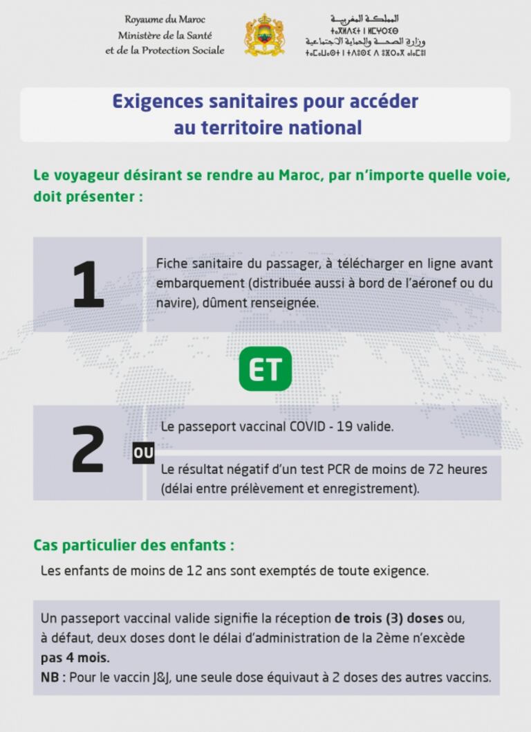 Désormais, les mesures sanitaires pour les différents points d’entrée au Maroc imposent la présentation d'un passeport vaccinal contre le SARS-Cov-2 valide, conformément au protocole national de vaccination, ou du résultat du test PCR. Ce résultat ne doit pas dépasser 72 heures, précise la tutelle dans un communiqué.