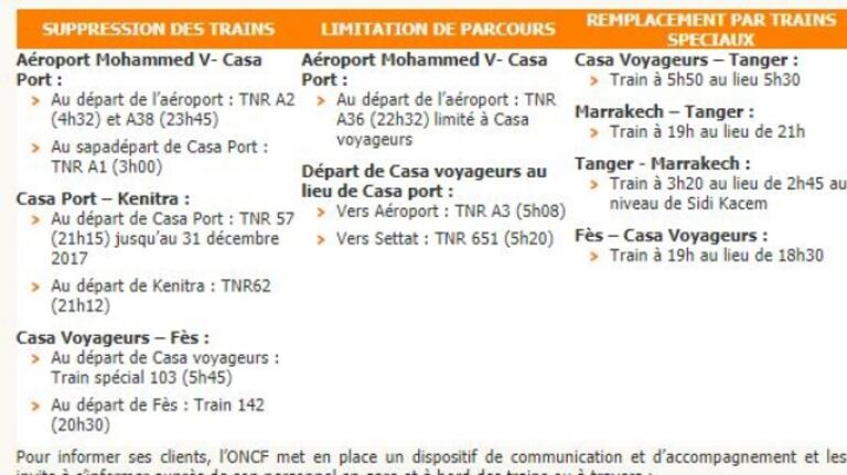 Dans le cadre de la poursuite des travaux de dé-saturation du carrefour ferroviaire de Casablanca et des gares de Rabat Agdal et Rabat Ville, l’ONCF réalise des travaux de remaniement des voies et de la caténaire qui imposent le réaménagement des horaires de certains trains circulant sur cet axe durant la période allant du vendredi 20 octobre jusqu’à la fin du 1er trimestre 2018.