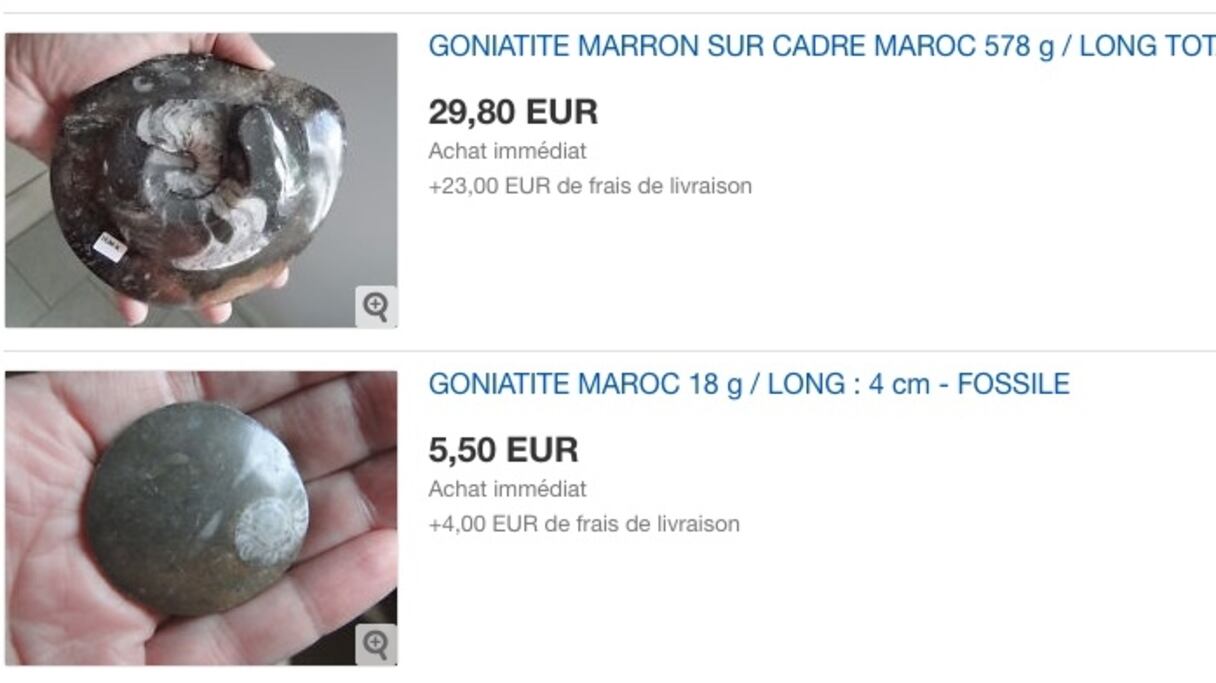 Le site de vente en ligne Ebay regorge d’objets du patrimoine géologique marocain. Ammonite Goniatite fossile du Maroc au prix de 25 euros, Fossile Goniatite Orthoceras à 5 euros. Il y en a pour tous les goûts et pour toutes les bourses. Ces objets géologiques, viennent du Maroc, et la plupart du Sud, de la Région d’Erfoud.