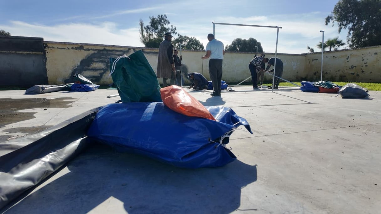 Placement de tentes dans la commune de Laaslouji pour les personnes évacuées.