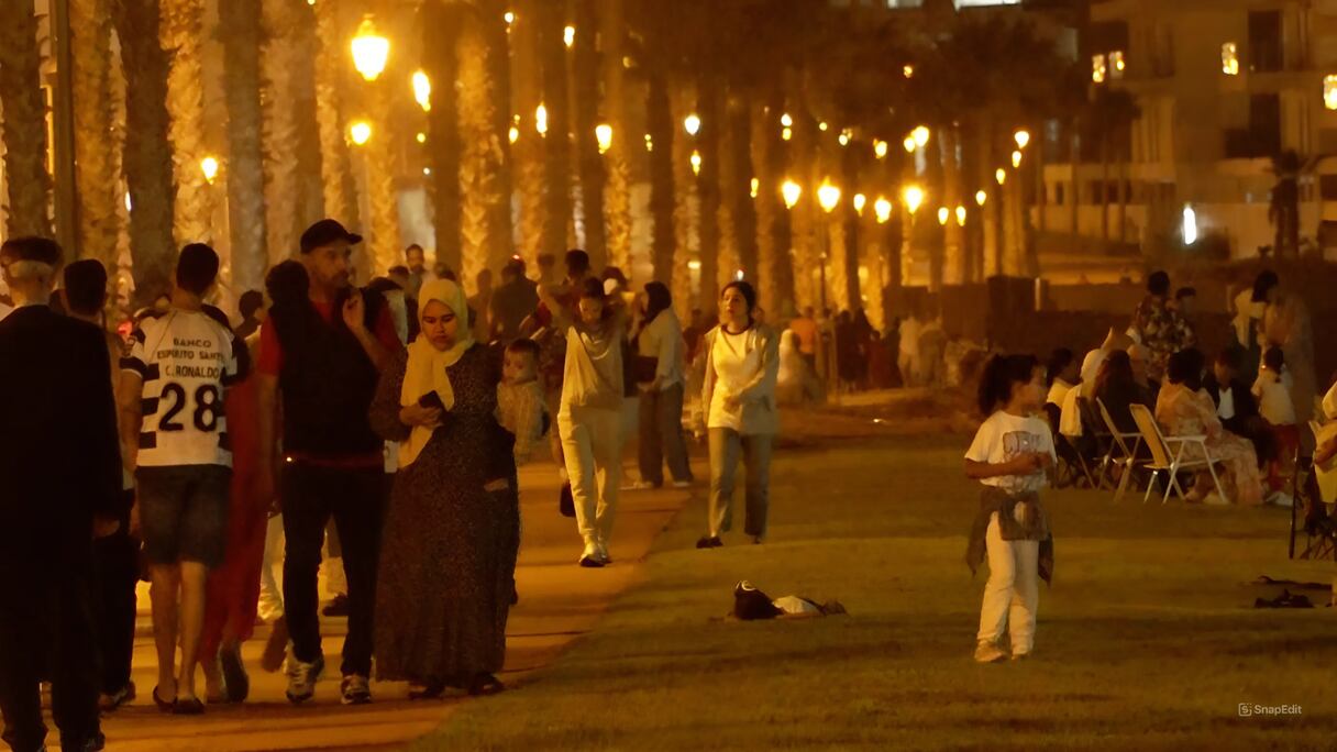 Dès la tombée de la nuit, les familles, accompagnées de leurs enfants, commencent à prendre place sur les pelouses des différents espaces verts de la ville, qui s’étendent sur une longueur de deux kilomètres, entre le quartier Al Akkari et la cité Hay El Fath. Certains visiteurs se regroupent autour de tables escamotables ramenées sur place, alors que d’autres s’assoient à même le sol pour des pique-niques improvisés jusque tard dans la nuit.