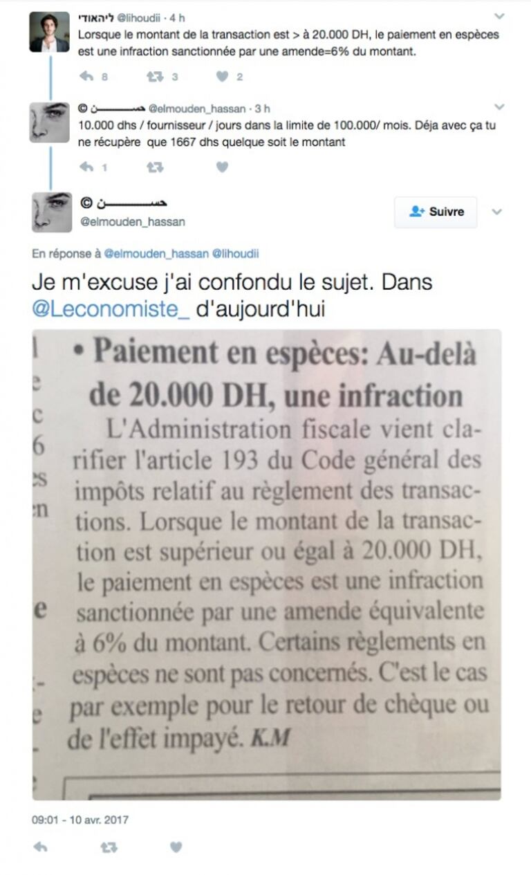 C'est une première. Une circulaire de la Direction générale des impôts, la fameuse DGI, fait réagir les internautes. Il s'agit de l'interdiction de paiement de la somme de 20.000 dirhams en liquide. Comme quoi, nos twittos s'occupent aussi de choses sérieuses.