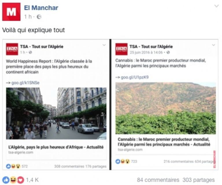 L'Algérie, premier pays le plus heureux en Afrique grâce au... Maroc?Toujours dans le cadre de la journée mondiale du bonheur, le rapport 2017 du World Happiness Report, dévoilé ce lundi 20 mars, classe l'Algérie comme premier pays le plus heureux d'Afrique. Et le Maroc y est peut-être pour quelque chose, d'après cette photo publiée par le site parodique El Manchar mettant le parallèle deux articles du site TSA (Tout sur l'Algérie).