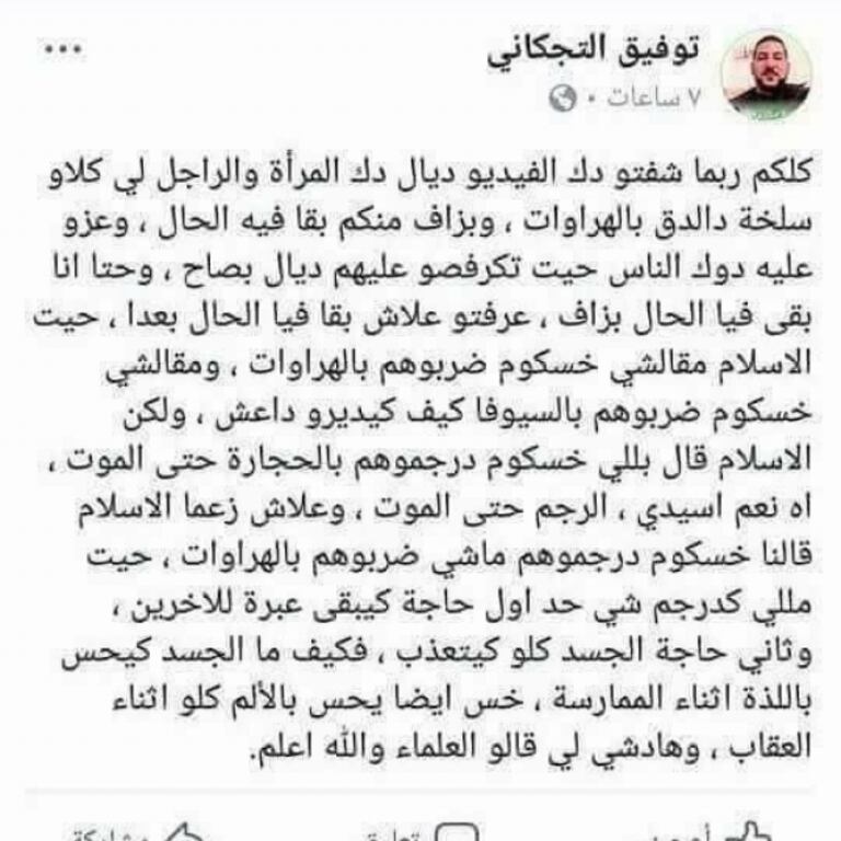 «Vous avez tous vu la vidéo de cette femme et de cet homme, qui ont été bastonnés… Ils vous ont fait pitié. Moi aussi, ils m’ont fait pitié. Vous savez pourquoi ? Parce que l’islam n’a pas dit de les bastonner, mais l’islam a dit de les lapider jusqu’à ce que mort s’ensuive pour qu’ils servent d’exemple», a-t-il écrit.