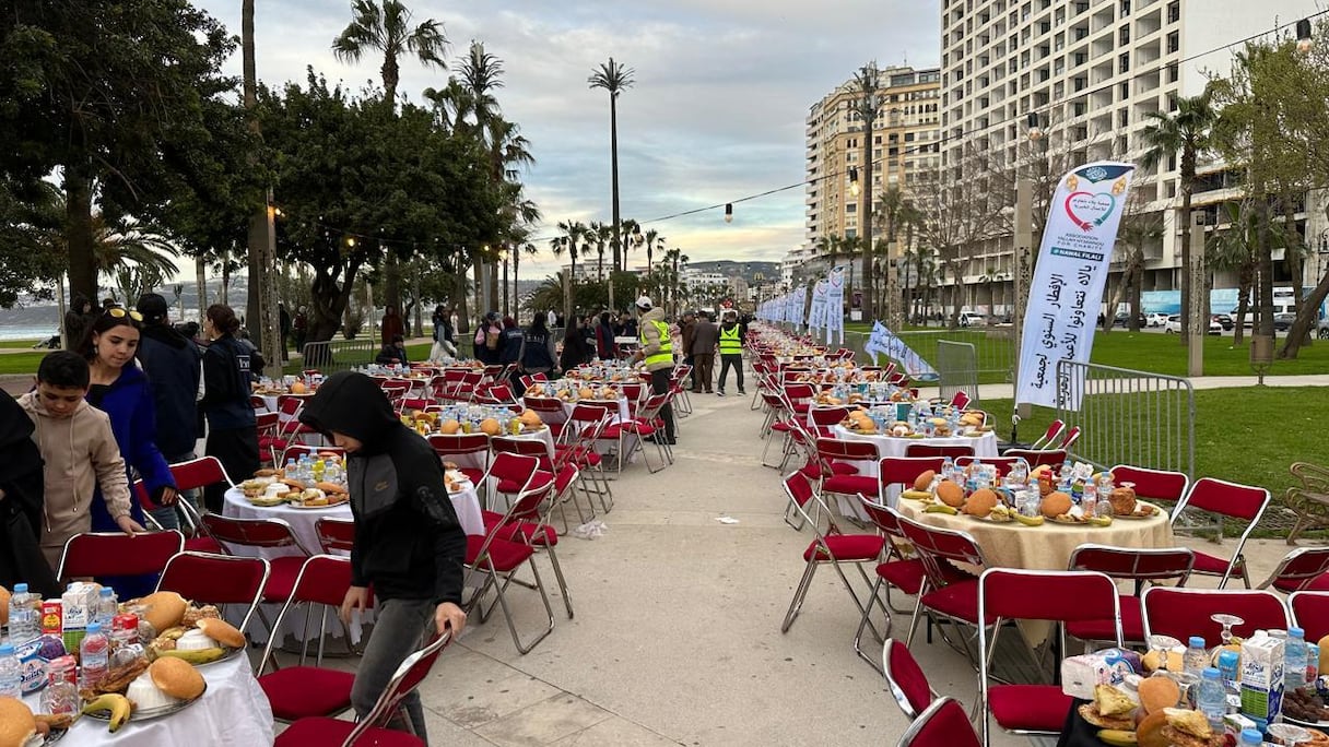 Mardi soir, à l’approche de l’adhan, la corniche de Tanger offrait un tableau rare. Face à l’océan, une table longue de plus de 300 mètres serpentait le long du littoral, prête à accueillir des milliers de jeûneurs. Dans une lumière douce de fin de journée, bénévoles et participants s’activaient dans une atmosphère mêlant effervescence et recueillement.