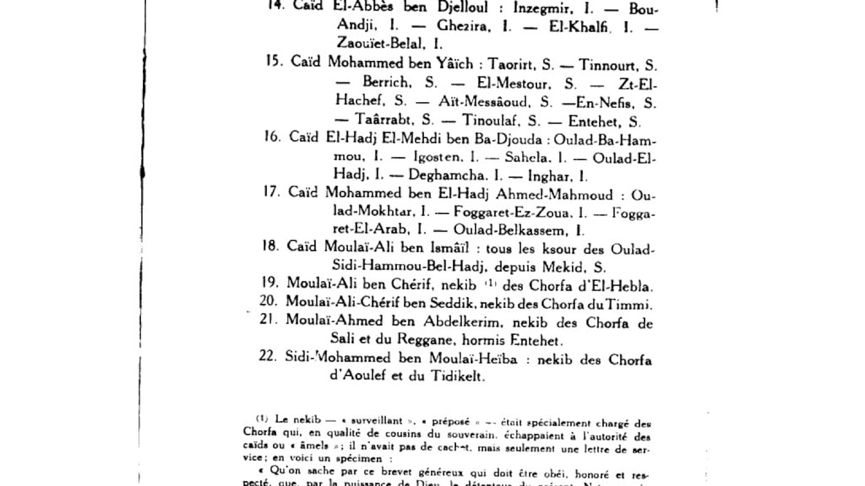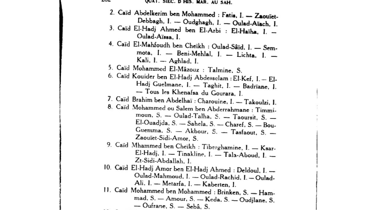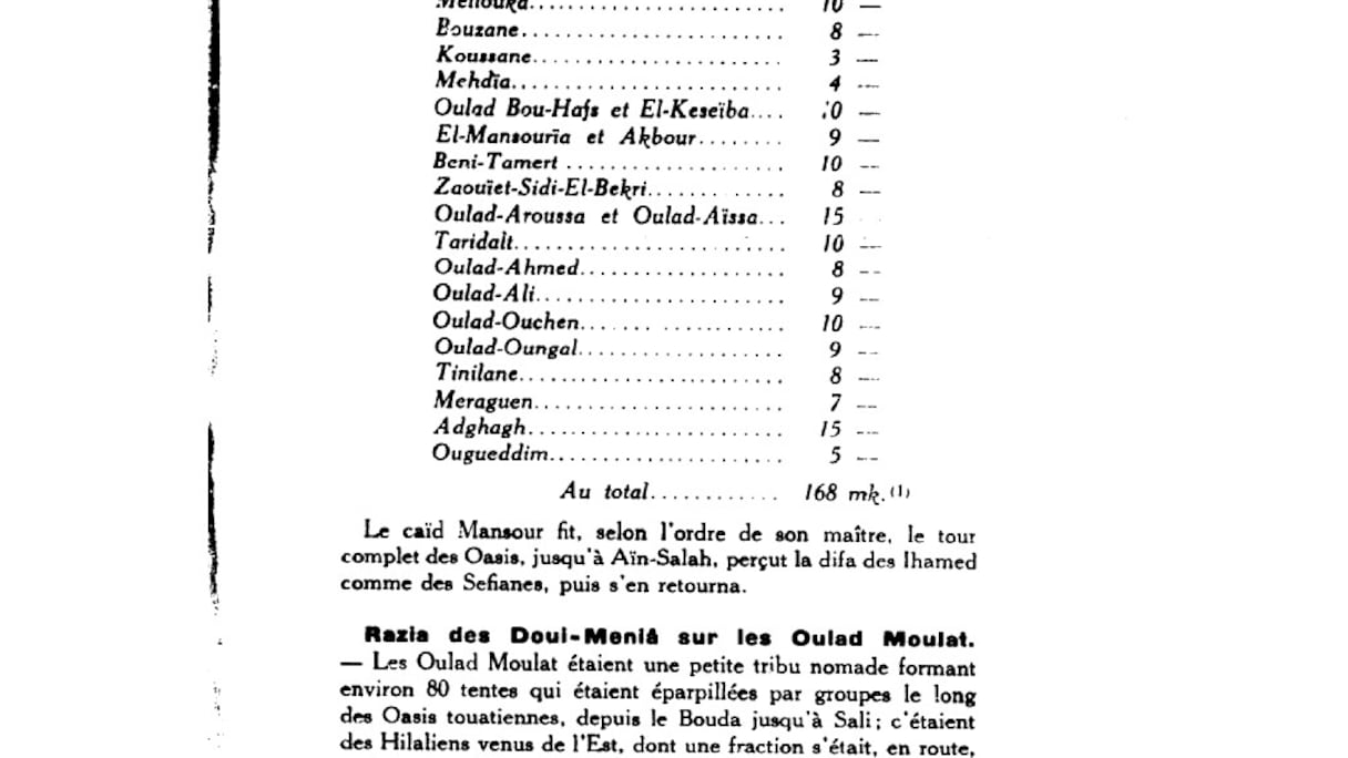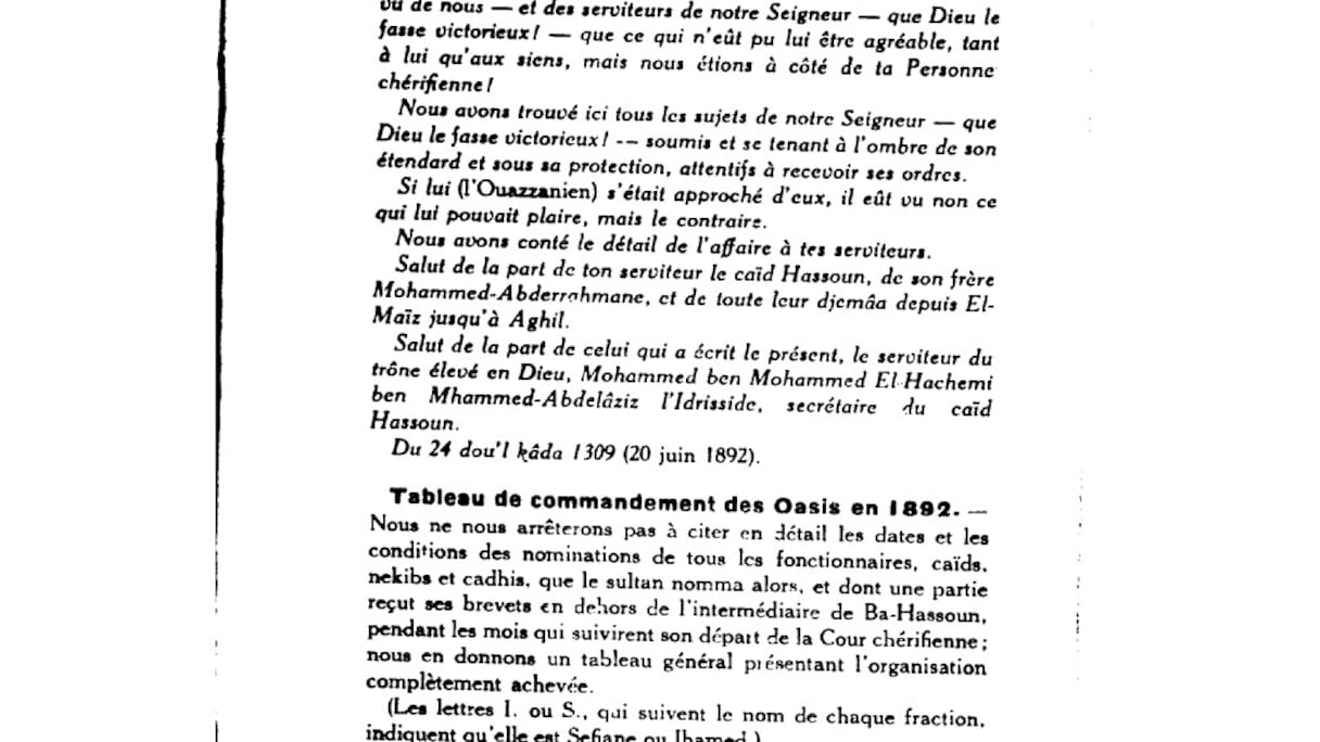 Citons les archives de Touat, traduites de l’arabe et éditées en France en 1926 par A.-G.-P. Martin («Quatre siècles d’histoire marocaine»), qui représentent une source historique inestimable sur la souveraineté marocaine sur le Sahara oriental. Ainsi pour la période 1860-1900, A.-G.-P. Martin publie la liste des noms des 30 derniers gouverneurs marocains envoyés par les sultans, que nous reproduisons ici: