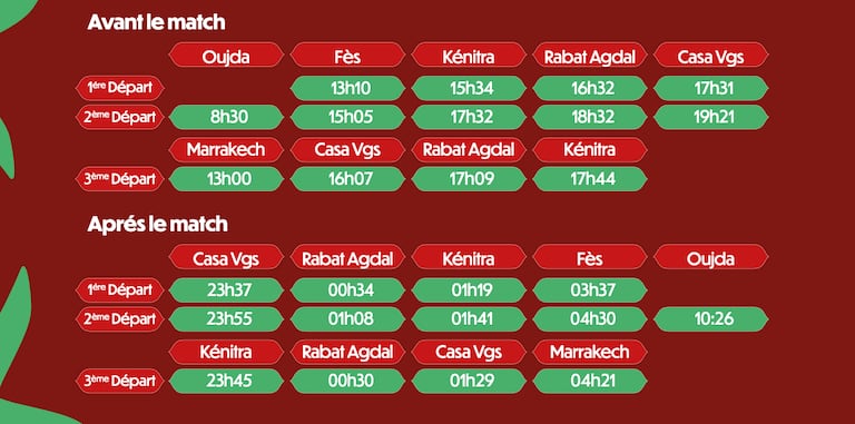 Les retours après match sont également renforcés sur le réseau Al Atlas. Deux trains sont programmés vers Fès au départ de Casablanca Voyageurs, le premier à 22h37 et le second à 23h05, ce dernier poursuivant son trajet jusqu’à Oujda avec une arrivée le lendemain matin à 9h36. Un train à destination de Marrakech partira quant à lui de Kénitra à 22h45, desservira Rabat et Casablanca avant d’arriver à Marrakech à 3h20. Pour la journée du 26 décembre, l’ensemble de ces horaires sera décalé d’une heure afin de s’adapter au calendrier du match.