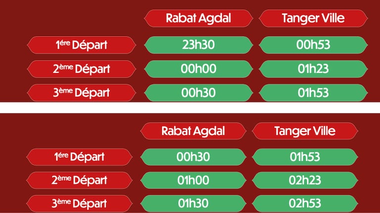 Un dispositif similaire est prévu pour le match Maroc–Mali, programmé le 26 décembre à un horaire plus tardif. Les départs depuis Tanger s’échelonneront cette fois de 15h à 19h, à raison d’un train par heure. Les retours après match seront assurés à 00h30, 1h et 1h30 du matin, afin de tenir compte de la fin tardive de la rencontre.