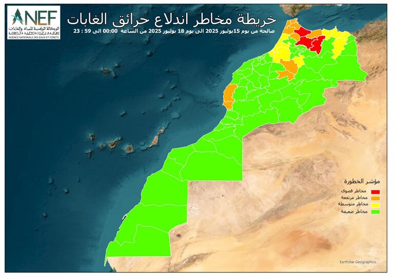 Dans un communiqué, l’Agence nationale des eaux et forêts (ANEF) a dévoilé des cartes de prévision du risque d’incendie, valables du 15 au 18 juillet, dressant un état des lieux précis des zones les plus vulnérables.