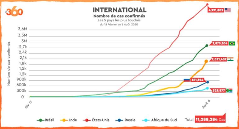 Plus de 18.843.580 cas d'infection ont été officiellement diagnostiqués dans 196 pays et territoires depuis le début de l'épidémie, dont au moins 11.159.300 sont aujourd'hui considérés comme guéris.