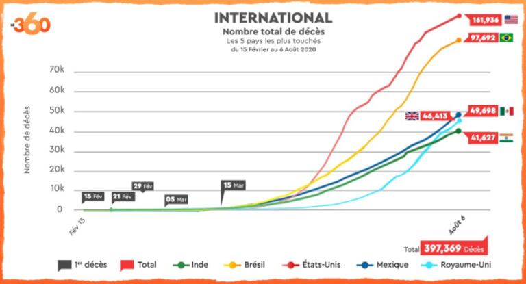 Après les États-Unis, les pays les plus touchés sont le Brésil avec 97.256 morts pour 2.859.073 cas, le Mexique avec 49.698 morts (456.100 cas), le Royaume-Uni avec 46.364 morts (307.184 cas), et l'Inde avec 40.699 morts (1.964.536 cas).