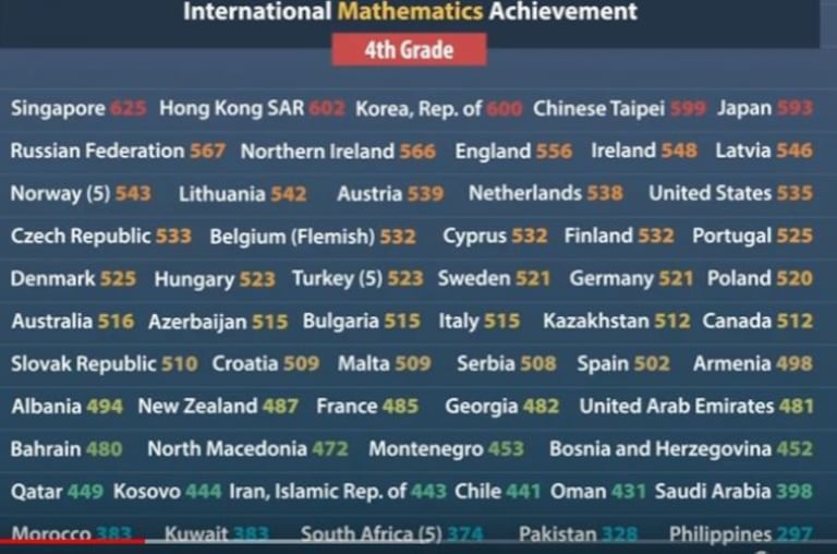 Le score est de 383 en mathématiques, bien loin de la référence centrale de l'échelle TIMSS qui est de 500. Cette étude réalisée exclusivement auprès des élèves de la quatrième année du primaire (CM1) et de la deuxième année du collège, montre tout de même que le Maroc a quelque peu amélioré son score par rapport au dernier résultat de 2016 où le pays a été classé à la 377ème place.
