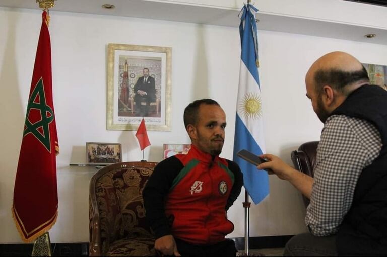 Un joueur de l'équipe nationale de football des petites tailles interrogée par un journaliste, lors d'une réception organisée par l'Ambassadeur du Maroc en Argentine.