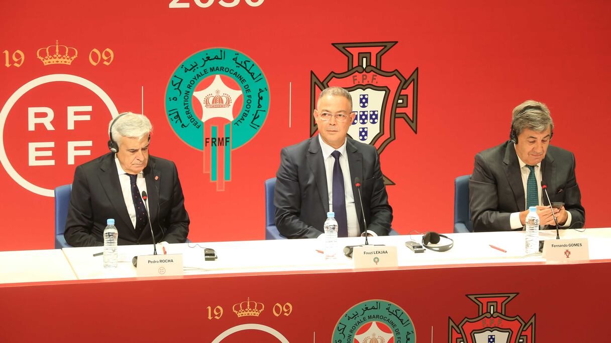 Fouzi Lekjaa, président de la Fédération royale marocaine de football, Pedro Rocha, président de la Commission de gestion de la Fédération royale espagnole de football, et Fernando Gomes, président de la Fédération portugaise de football, le samedi 29 octobre au Complexe Mohammed VI de football.