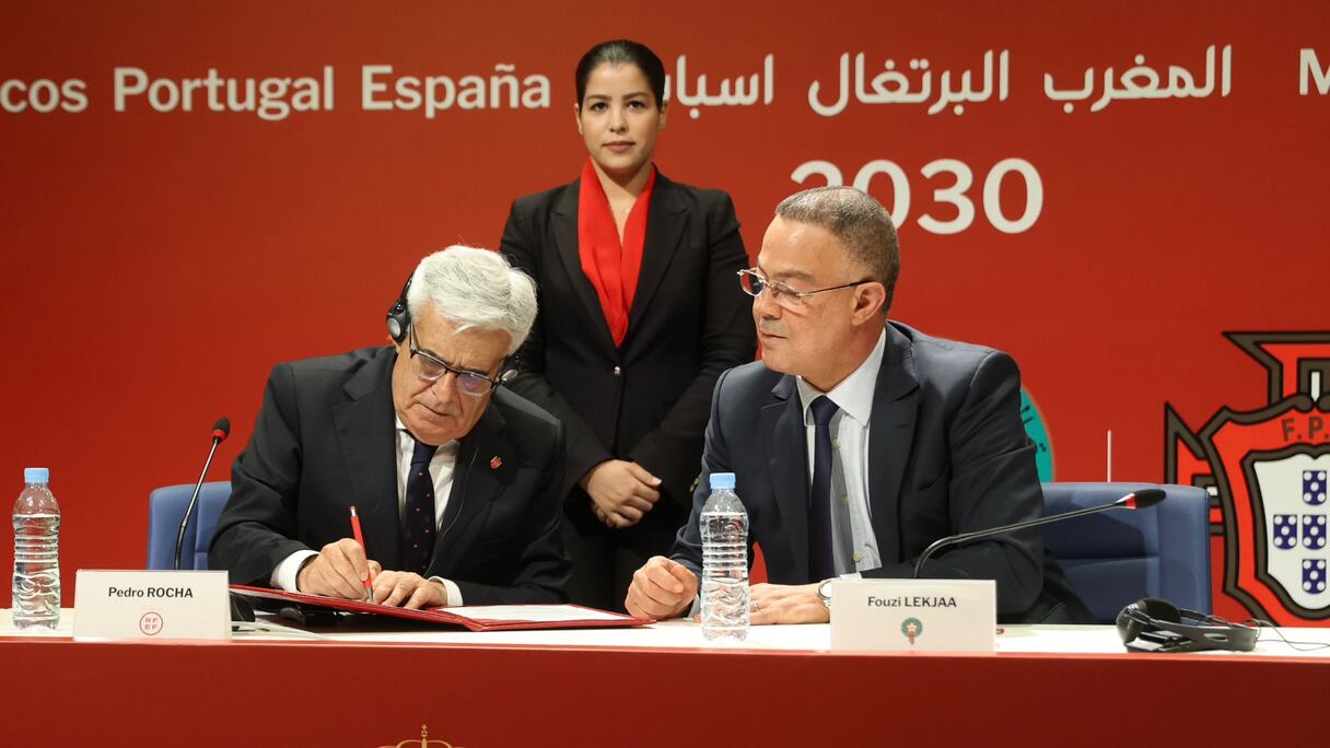 Fouzi Lekjaa, président de la Fédération royale marocaine de football, et Pedro Rocha, président de la Commission de gestion de la Fédération royale espagnole de football.