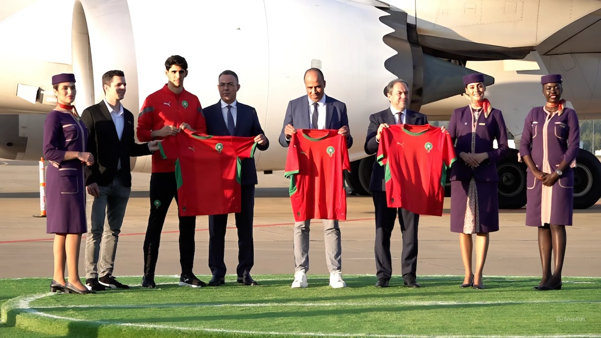 L’événement s’est déroulé aujourd’hui à l’aéroport de Rabat-Salé en présence de Faouzi Lakjaa, président de la FRMF, et d’Abdelhamid Addou, PDG de la RAM. La cérémonie a également vu la participation de Yassine Mejbar, directeur marketing de Planet Sport, et de Petter Dangl, directeur chez l’équipementier EEMEA Distribution. La présentation des nouveaux maillots a été confiée au gardien de but de l’équipe nationale, Yassine Bounou, qui a reçu les acclamations enthousiastes de l’assistance, rassemblée sur une tribune dressée pour l’occasion face à un avion Dreamliner (B787) de la RAM, peint aux couleurs nationales, le rouge et le vert.